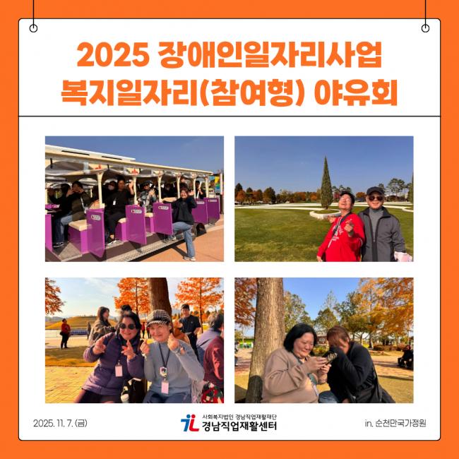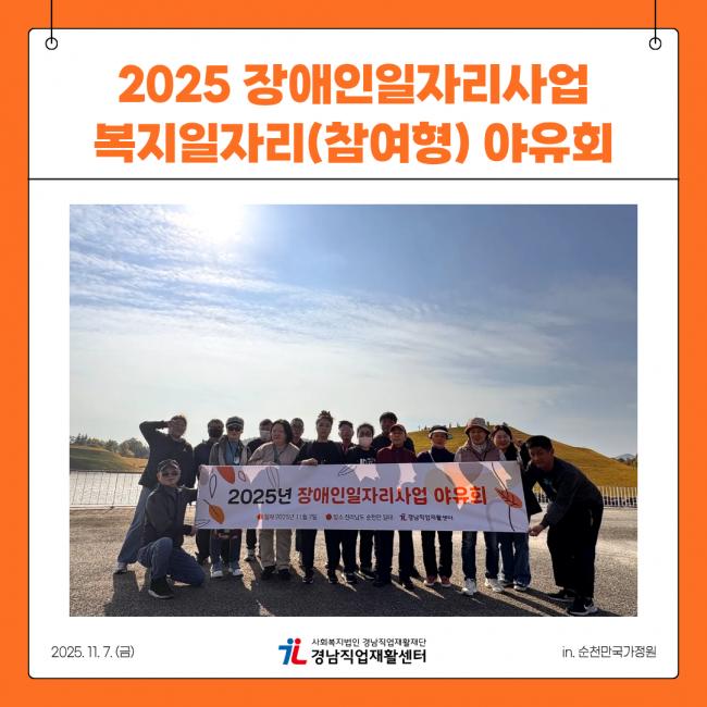경남직업재활센터는 지난 11월 7일(금), 2025년 장애인일자리사업 복지일자리(참여형) 참여자분들과 울긋불긋 가을색으로 물든 "순천만국가정원" 으로 야유회를 다녀왔습니다.이번 야유회는 일상에서 벗어나 자연 속에서 여가를 즐기며 재충전할 수 있는 시간을 제공하기 위해 마련되었습니다. 참여자들은 맑은 가을 하늘 아래에서 웃음 가득한 하루를 보냈으며, 서로의 소중함을 다시 한번 느끼는 뜻 깊은 시간이 되었습니다. 또한 단체 식사와 다양한 프로그램을 통해 참여자 간의 유대감이 강화되고, 직무 스트레스 해소와 정서적 안정에도 도움이 되었습니다.