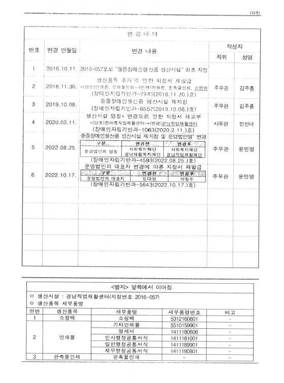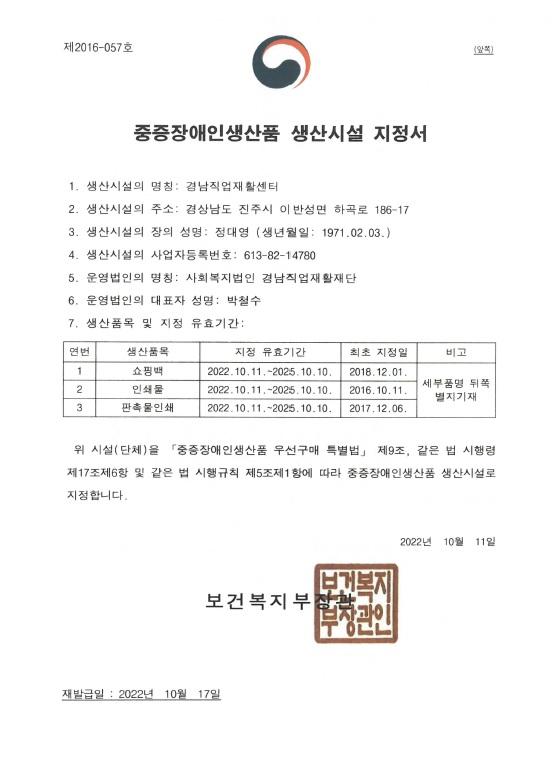 중증장애인생산품 생산시설 지정서